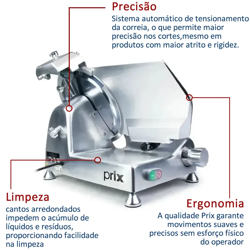 O fatiador Prix Agile 300S é ideal para atendimento direto ao consumidor, graças à sua operação simples e produção sob demanda. Possui afiador de lâmina integrado, facilitando a manutenção, e cantos arredondados, que contribuem para a limpeza e higiene do equipamento.